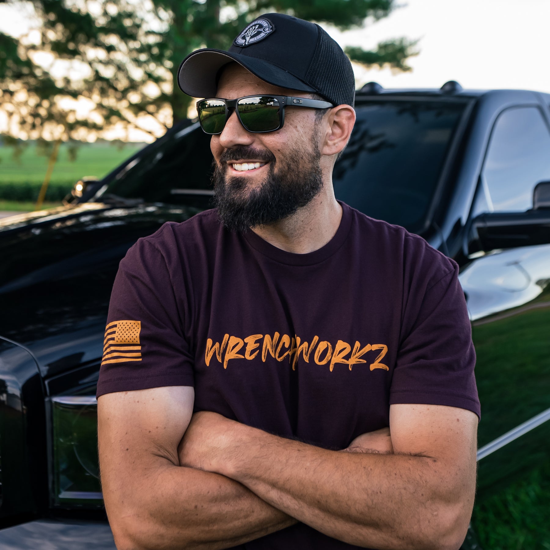 Short sleeve black cotton t-shirt with WrenchWorkz logo center chest. American flag on sleeve